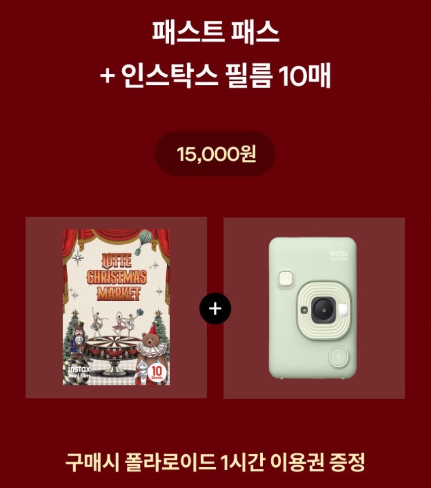 - 해당 세트를 구매하면 폴라로이드 1시간 이용권이 추가로 증정됩니다. 폴라로이드 카메라로 소중한 추억을 남길 수 있는 특별한 혜택입니다.
