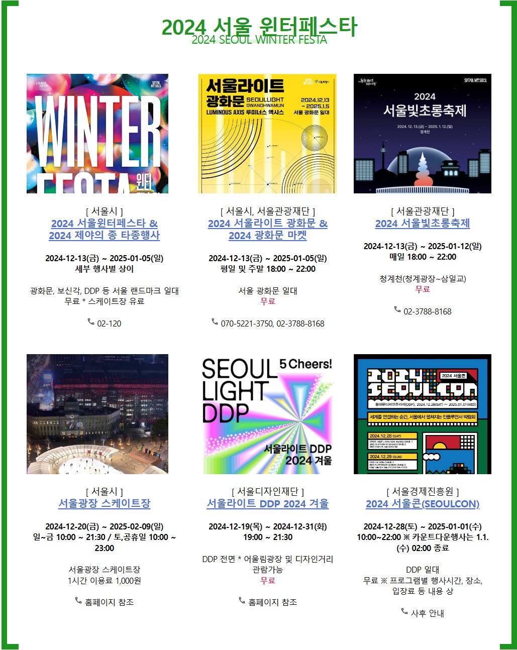 서울의 12월은 문화와 축제로 가득 찬 계절입니다. 이번 포스팅에서 소개한 서울 12월 문화 달력은 공연, 전시, 체험 프로그램, 그리고 윈터페스타 등 다양한 이벤트 정보를 포함해 누구나 즐길 수 있는 겨울 가이드를 제공합니다.