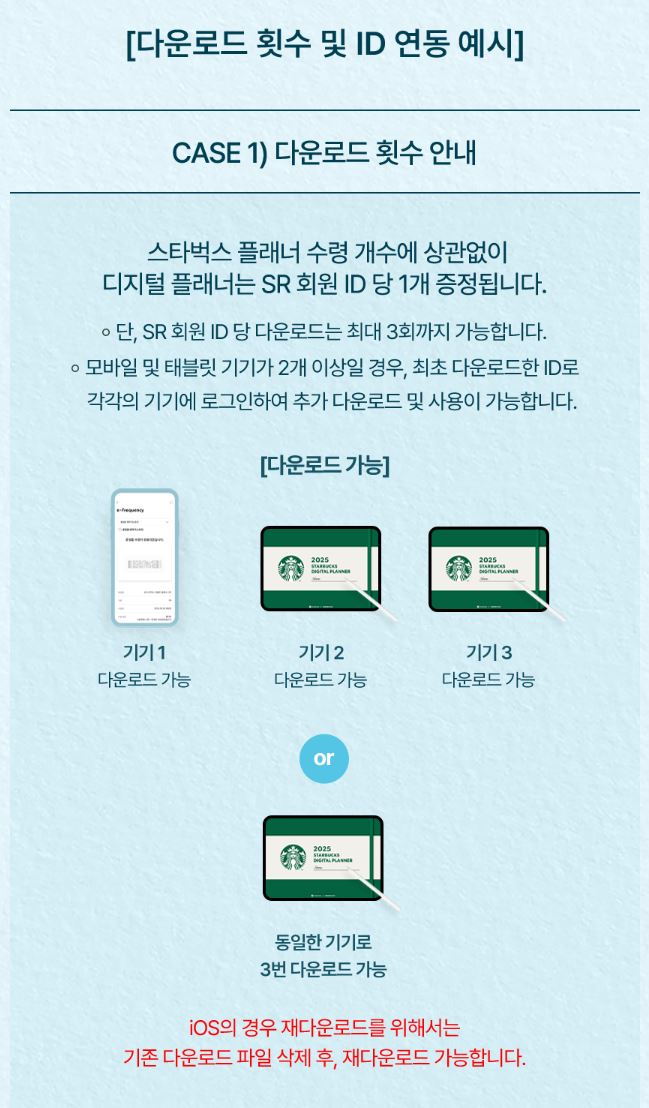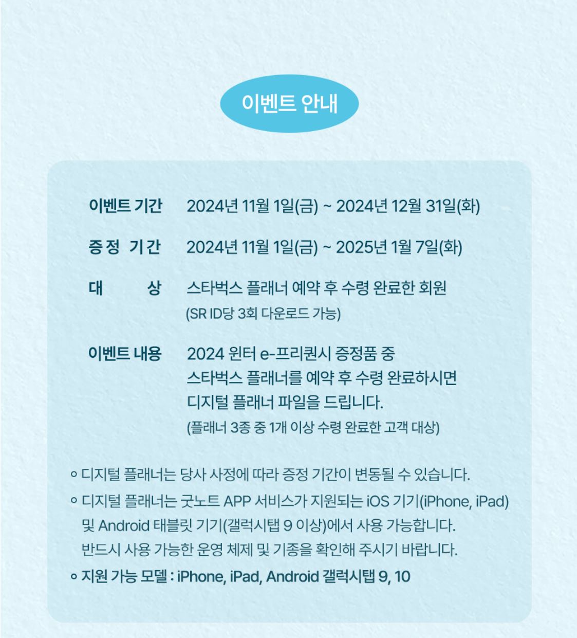 - 대상: 스타벅스 플래너 예약 후 수령을 완료한 SR 회원 (SR ID당 3회 다운로드 가능)