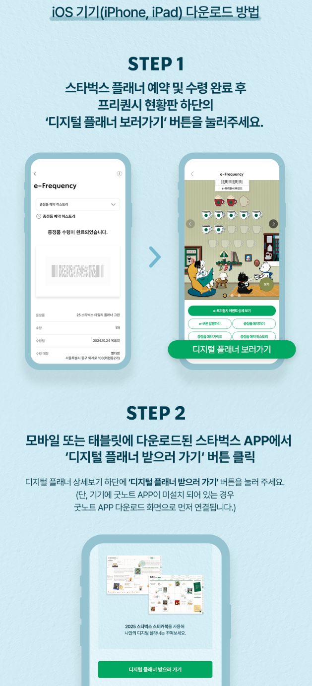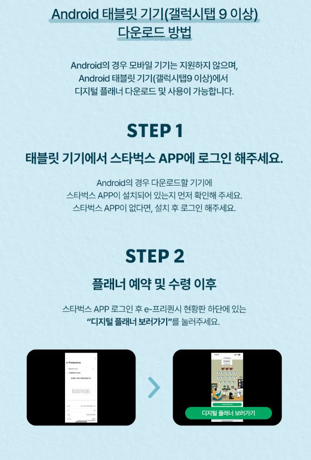 - 디지털 플래너 예약 및 수령: 스타벅스 앱의 e-프리퀀시 현황판에서 디지털 플래너 보러가기 버튼을 클릭합니다.