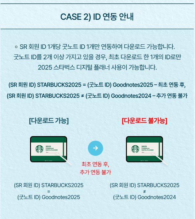 예를 들어, SR 회원 ID가 "STARBUCKS2025"이고 Goodnotes ID가 "Goodnotes2025"로 연동된 경우에만 플래너를 사용할 수 있으며, 다른 Goodnotes ID로는 연동이 불가능합니다.