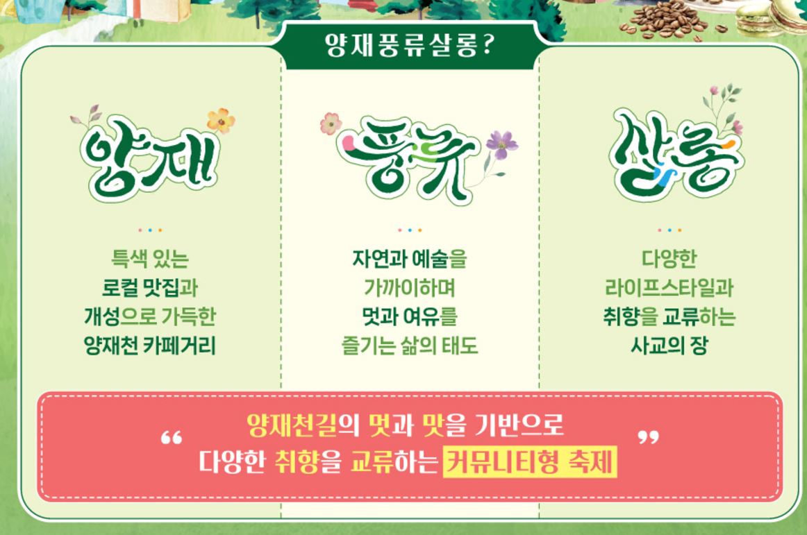 2024 양재풍류살롱 축제에서 러닝살롱, 낮술 인문학, 갓생데이, 컬처나잇 등 다채로운 프로그램을 즐기며 양재천길의 멋과 맛을 경험해 보세요. 서초구 양재천에서 열리는 커뮤니티형 축제로 새로운 취향과 라이프스타일을 발견할 수 있는 완벽한 기회입니다.