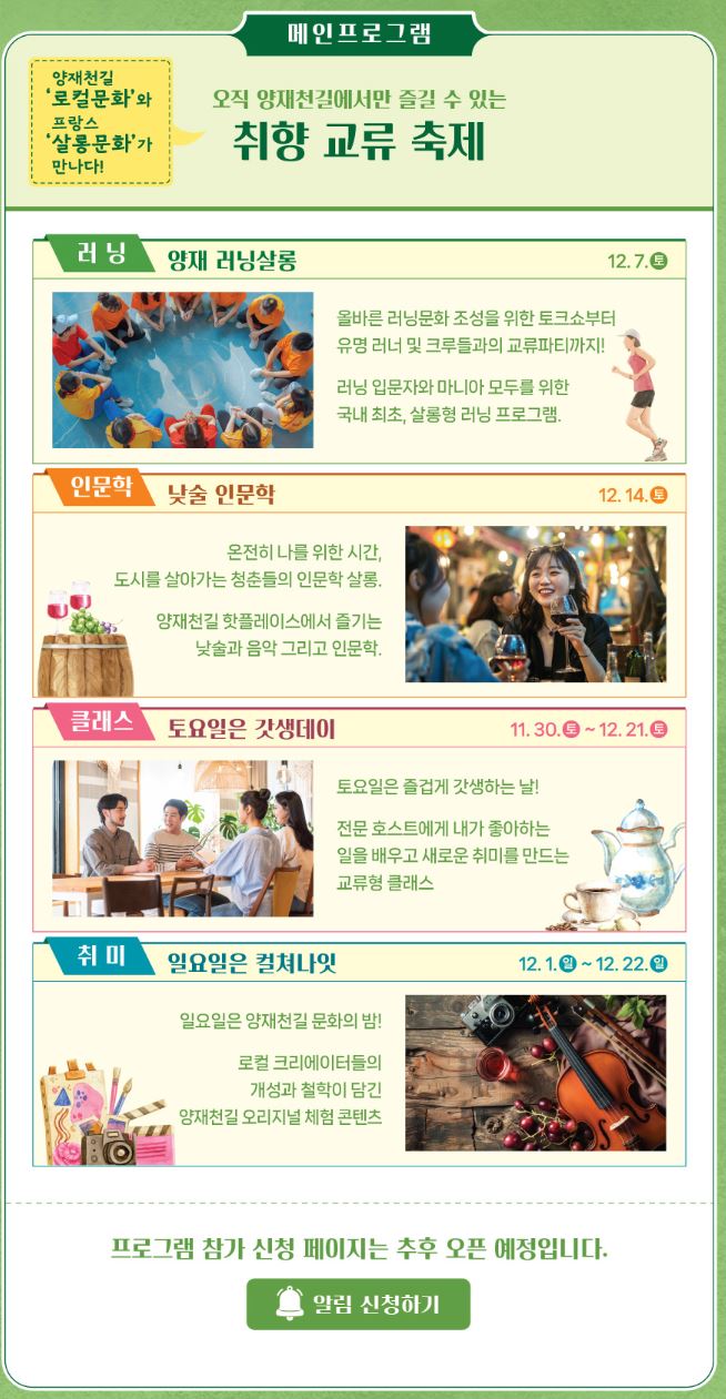 모든 프로그램은 사전 신청을 통해 참여할 수 있으며, 신청 페이지는 양재풍류살롱 공식 웹사이트에서 추후 오픈될 예정입니다. 알림 설정을 통해 신청 오픈 알림을 받을 수 있으니, 관심 있는 분들은 미리 알림을 신청해 주세요. 인기 프로그램은 조기 마감될 가능성이 있으니 빠르게 확인하시길 추천드립니다.