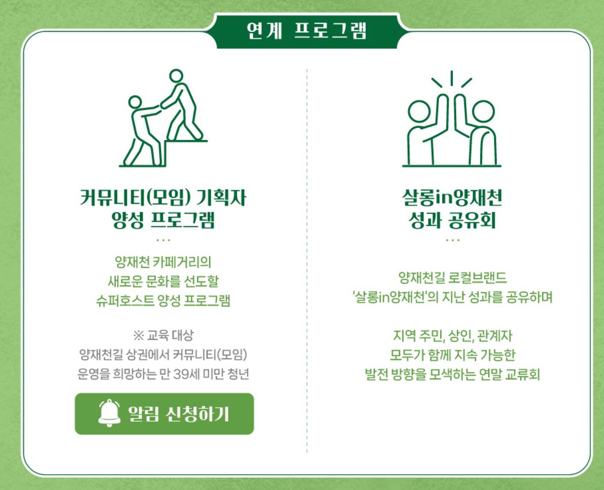 - 참가 대상: 지역 주민, 상인, 관계자 등 양재천길 발전에 관심 있는 사람 누구나