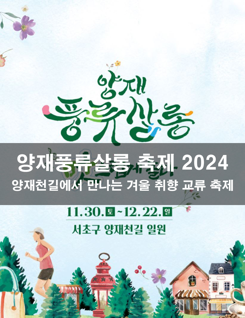 양재풍류살롱 축제 2024는 지역 사회와 방문객들이 한자리에 모여 양재천길의 독특한 매력을 경험하고, 다양한 프로그램을 통해 서로의 취향을 공유하며 교류할 수 있는 특별한 기회를 제공합니다. 프랑스의 살롱 문화처럼 자유롭고 편안한 분위기 속에서 로컬 크리에이터, 맛집, 예술 체험 등을 함께 즐길 수 있는 이번 축제는 모든 세대가 함께할 수 있는 커뮤니티형 이벤트입니다. 양재천길에서 멋과 맛을 기반으로 한 취향 교류의 장을 경험하고, 소중한 겨울 추억을 쌓아 보세요. 양재풍류살롱 축제는 양재천을 방문하는 누구에게나 따뜻하고 의미 있는 시간을 선사할 것입니다. 최신 정보와 신청 방법은 양재풍류살롱 공식 웹사이트에서 확인하실 수 있습니다.