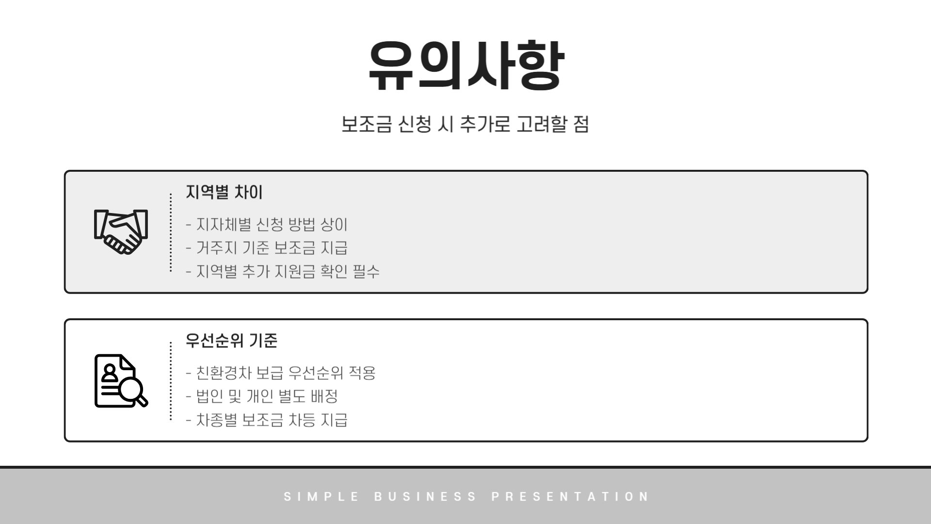 - 신청 시기: 보조금은 선착순으로 소진되므로 예산이 남아있을 때 빠르게 신청하는 것이 핵심입니다.