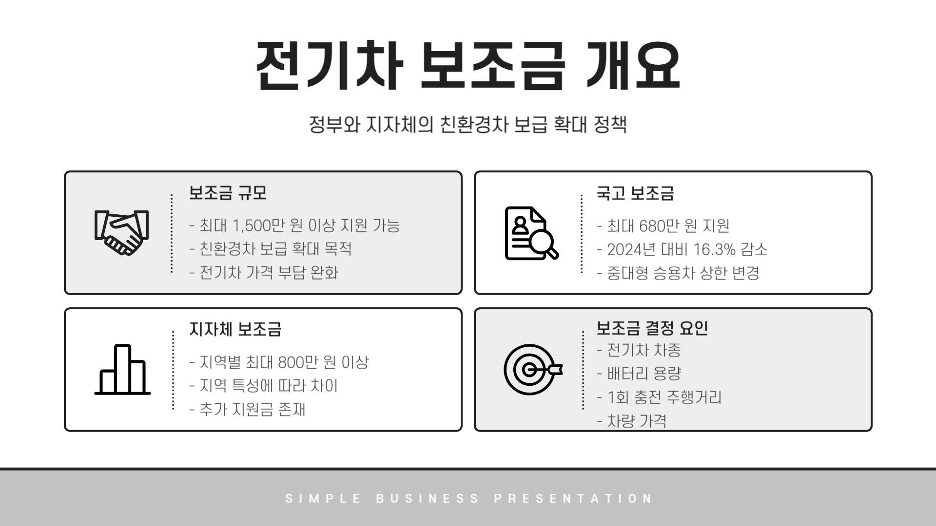 보조금은 전기차 차종, 배터리 용량, 1회 충전 주행거리, 차량 가격에 따라 달라지므로 사전 확인이 필수입니다.