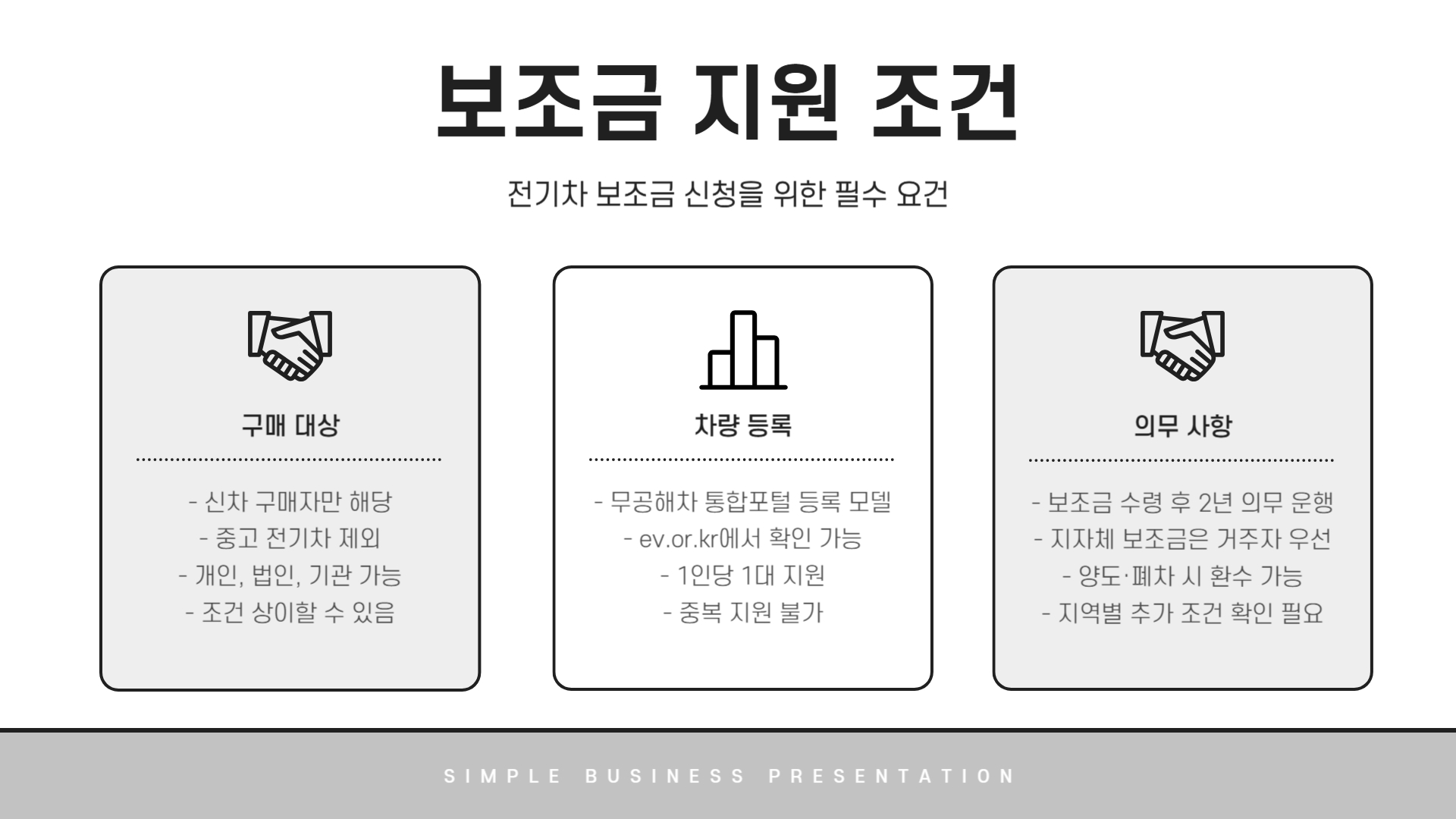- 중복 수령 불가: 이미 전기차 보조금을 받은 이력이 있는 경우, 추가 신청은 불가능합니다.