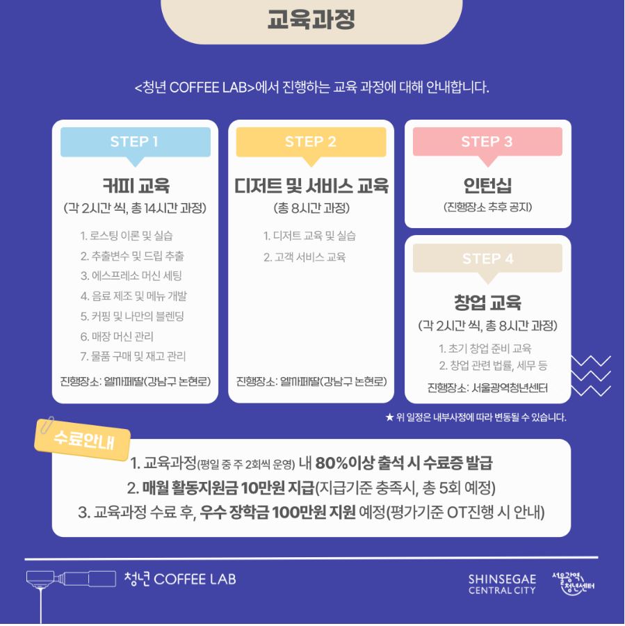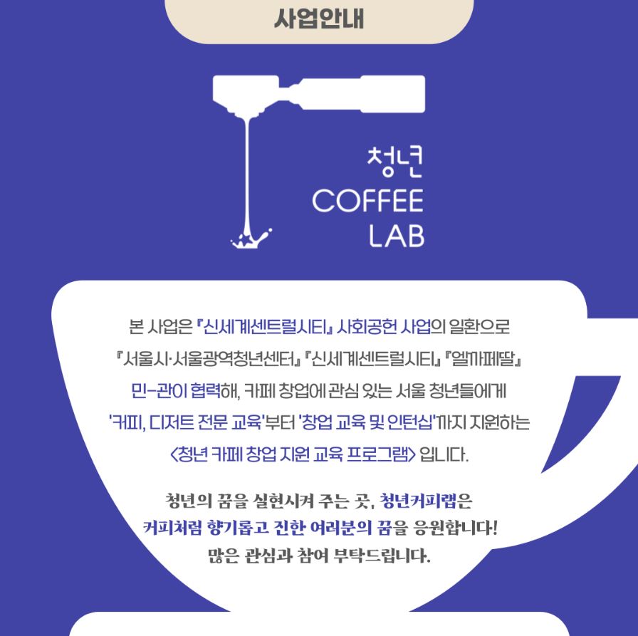 청년 COFFEE LAB 시즌2는 서울시와 신세계센트럴시티가 협력하여 청년들의 커피 창업을 지원하기 위해 마련한 특별한 교육 프로그램입니다. 카페 창업에 필요한 실무 지식부터 창업 컨설팅, 그리고 인턴십까지 제공하는 체계적인 프로그램으로, 커피 업계에서 성공적인 창업을 꿈꾸는 청년들에게 꼭 필요한 과정입니다.