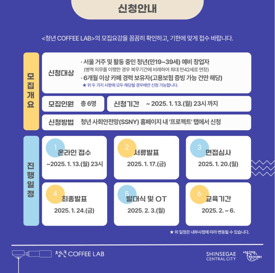 신청은 2025년 1월 13일까지 온라인으로 접수 가능하며, 서류 및 면접 과정을 통해 최종 참가자를 선발합니다. 이 모든 과정을 거쳐 자신의 창업 역량을 키우고, 커피 창업의 첫걸음을 내디뎌 보세요.