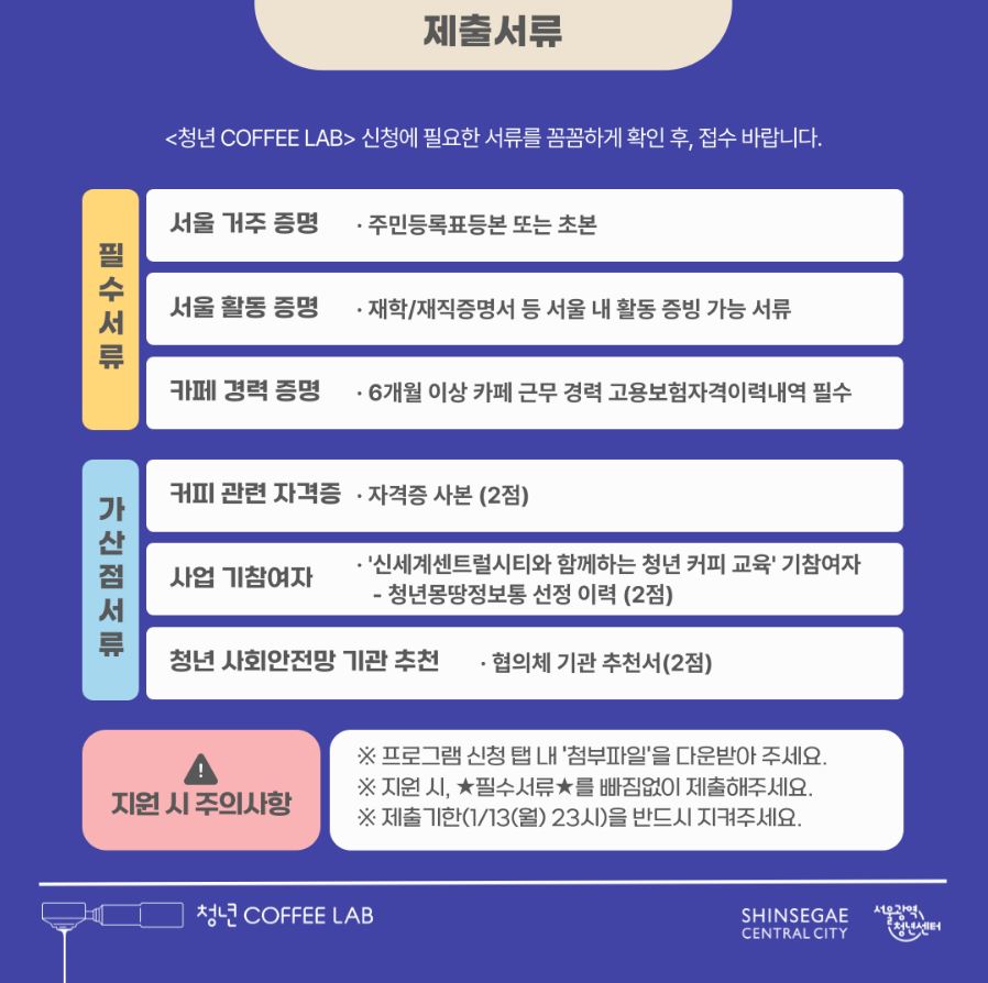 청년 COFFEE LAB 시즌2를 통해 여러분도 커피 창업의 꿈을 현실로 만들어보세요. 신청 마감 전에 서둘러 지원하시고, 내일의 성공을 향한 첫걸음을 함께하세요!