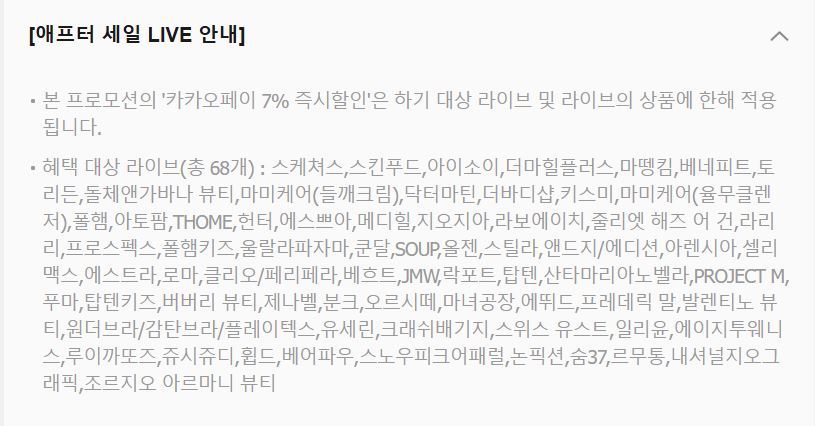 카카오 AFTER SALE 라이브 방송에는 총 68개의 브랜드가 참여합니다. 패션과 뷰티를 포함해 다양한 제품군이 준비되어 있어 모든 소비자가 만족할 만한 구성을 자랑하죠. 라이브 방송 참여 브랜드는 다음과 같습니다.