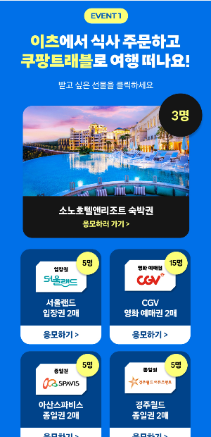 - 쿠팡이츠어플의 MY이츠에 들어가서 진행 중인 이벤트 페이지로 이동하여 식사는 이츠. 여행은 트래블을 찾아 들어간 후 ‘응모하기’ 버튼을 클릭해야 응모가 완료됩니다. 단순히 주문만 해서는 응모가 되지 않으니 꼭 ‘응모하기’ 버튼을 눌러주세요.