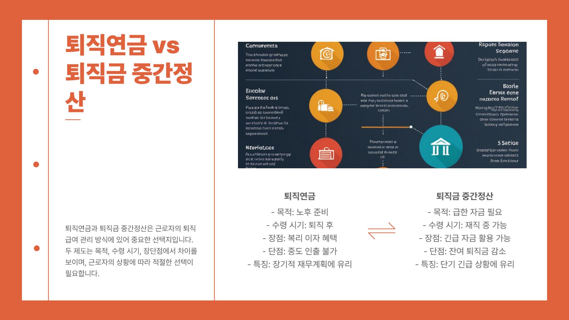 장기적 재무계획이 필요하다면 퇴직연금, 단기 긴급 상황이라면 퇴직금 중간정산이 유리합니다.