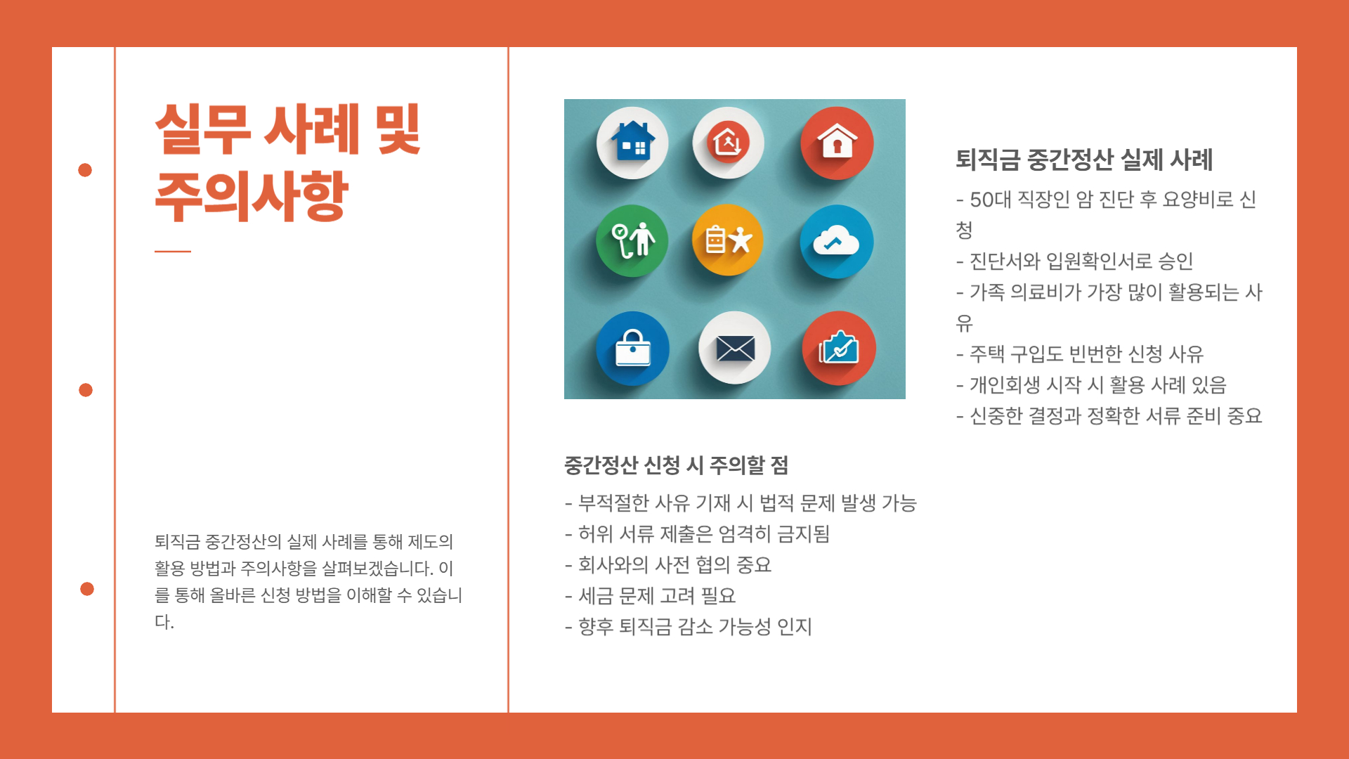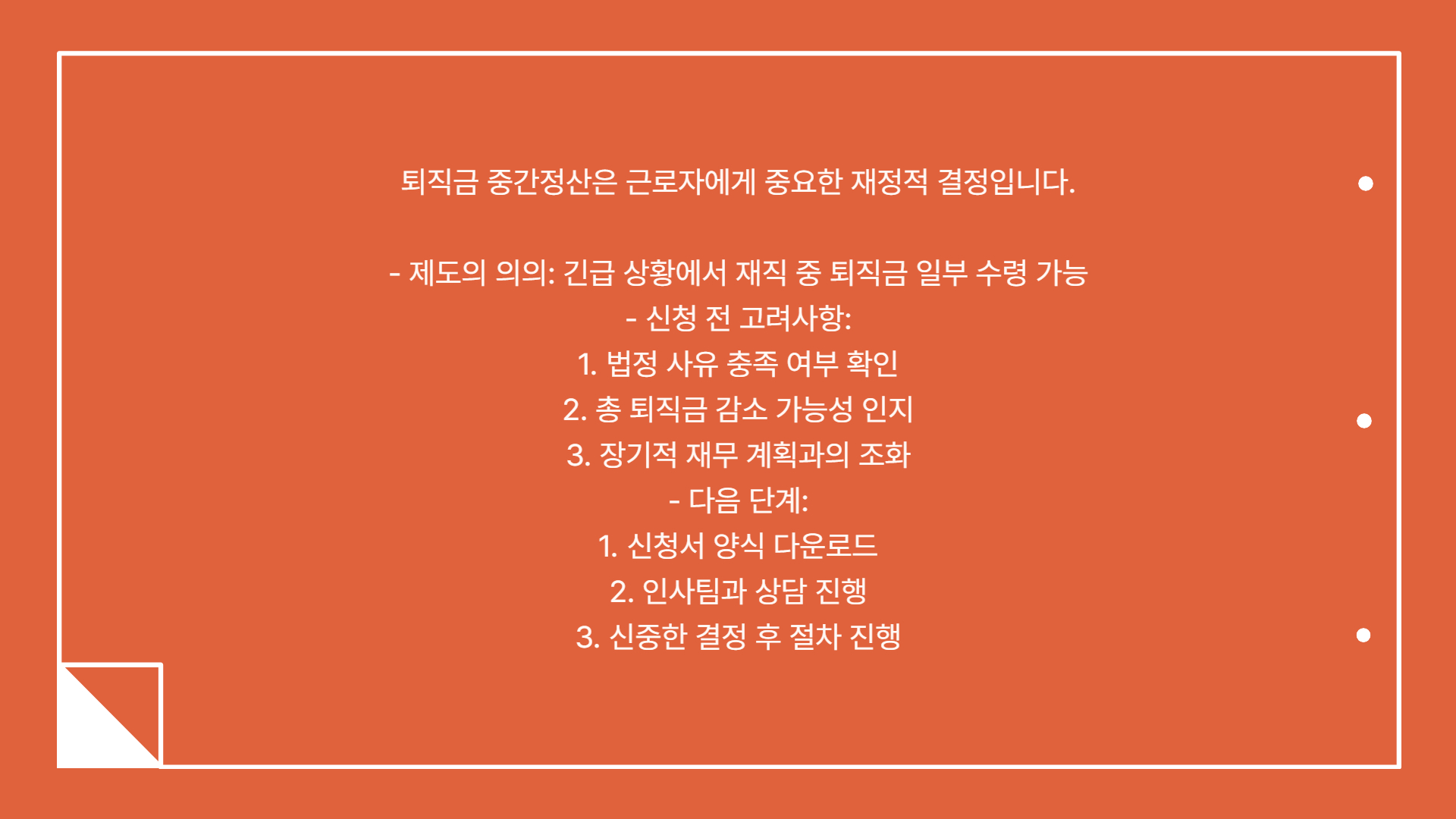 퇴직금 중간정산은 쉽지 않은 결정이지만, 필요할 때 현명하게 활용하면 삶의 숨통을 틔울 수 있는 제도입니다.