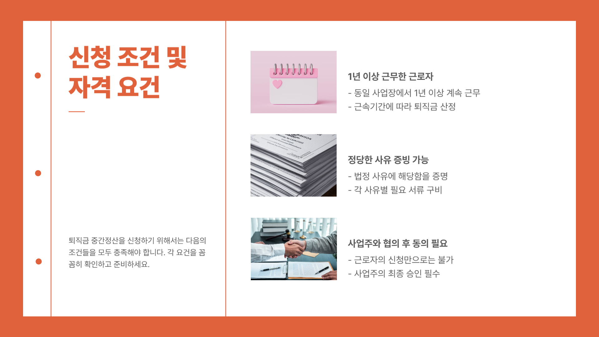퇴직금 중간정산 신청을 위한 자격 요건은 다음과 같습니다.