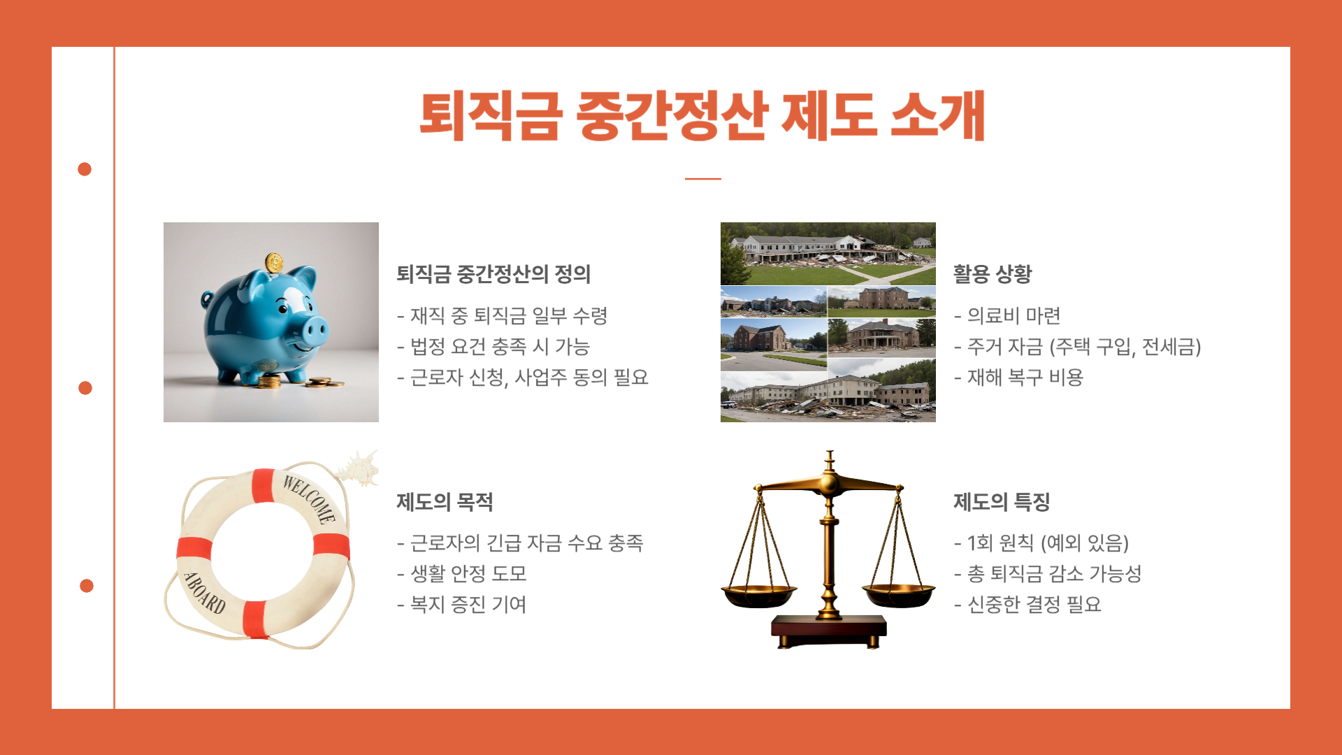 퇴직금 중간정산 제도는 재직 중인 근로자가 일정 조건을 충족할 경우, 퇴직하지 않고도 퇴직금을 일부 받을 수 있도록 한 제도입니다. 갑작스러운 의료비나 주거 자금 등 큰 지출이 있을 때, 이 제도는 실제로 많은 도움이 됩니다.