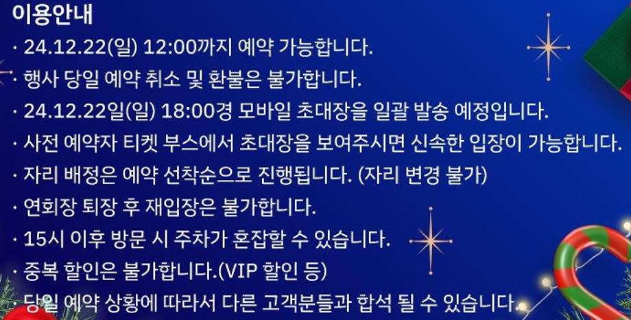 - 예약 마감: 12월 22일(일) 오후 12시까지 예약 가능