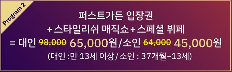 입장권에는 퍼스트가든 입장, 스타일리쉬 매직쇼 관람, 크리스마스 특별 뷔페 이용이 모두 포함되어 있어, 가족 단위로 즐기기에 좋은 패키지입니다.