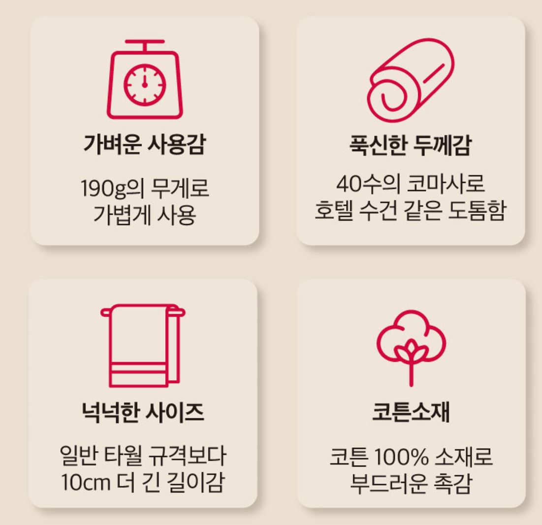 - 크기: 페이스 타월(50x90cm), 핸드 타월(30x30cm)
