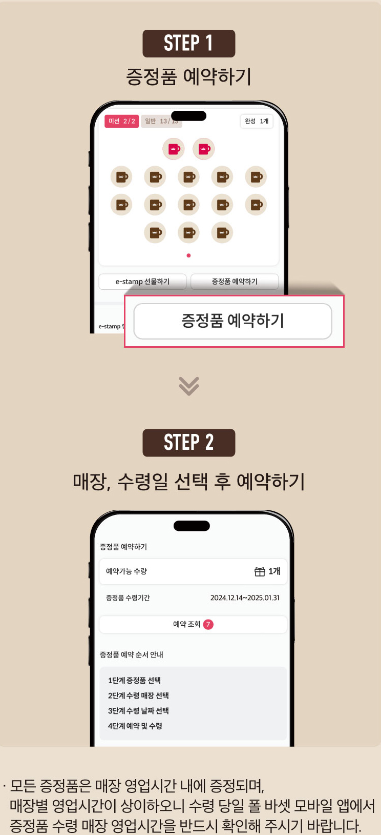이벤트 기간 동안 e-stamp 15개(미션 음료 2개 포함)를 모아야 증정품을 받을 수 있습니다. 증정품 수령은 예약제로 진행되며, 기간 내 예약하지 않으면 스탬프가 소멸되니 주의하세요!