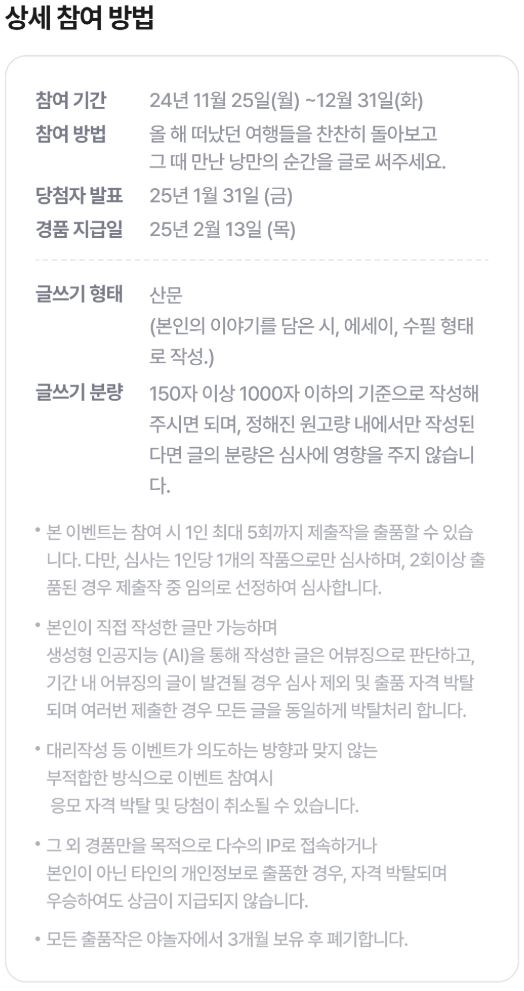 - 직접 작성 필수: 모든 글은 본인이 직접 작성해야 하며, AI 생성 글, 표절, 또는 타인의 저작물을 도용한 글은 심사에서 제외됩니다.