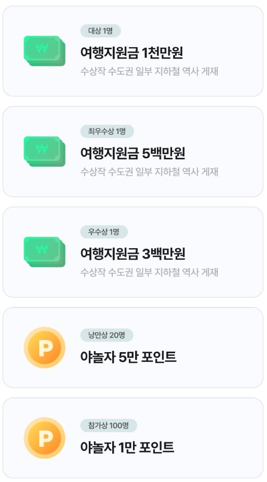 - 최우수상(1명): 여행 지원금 5백만 원