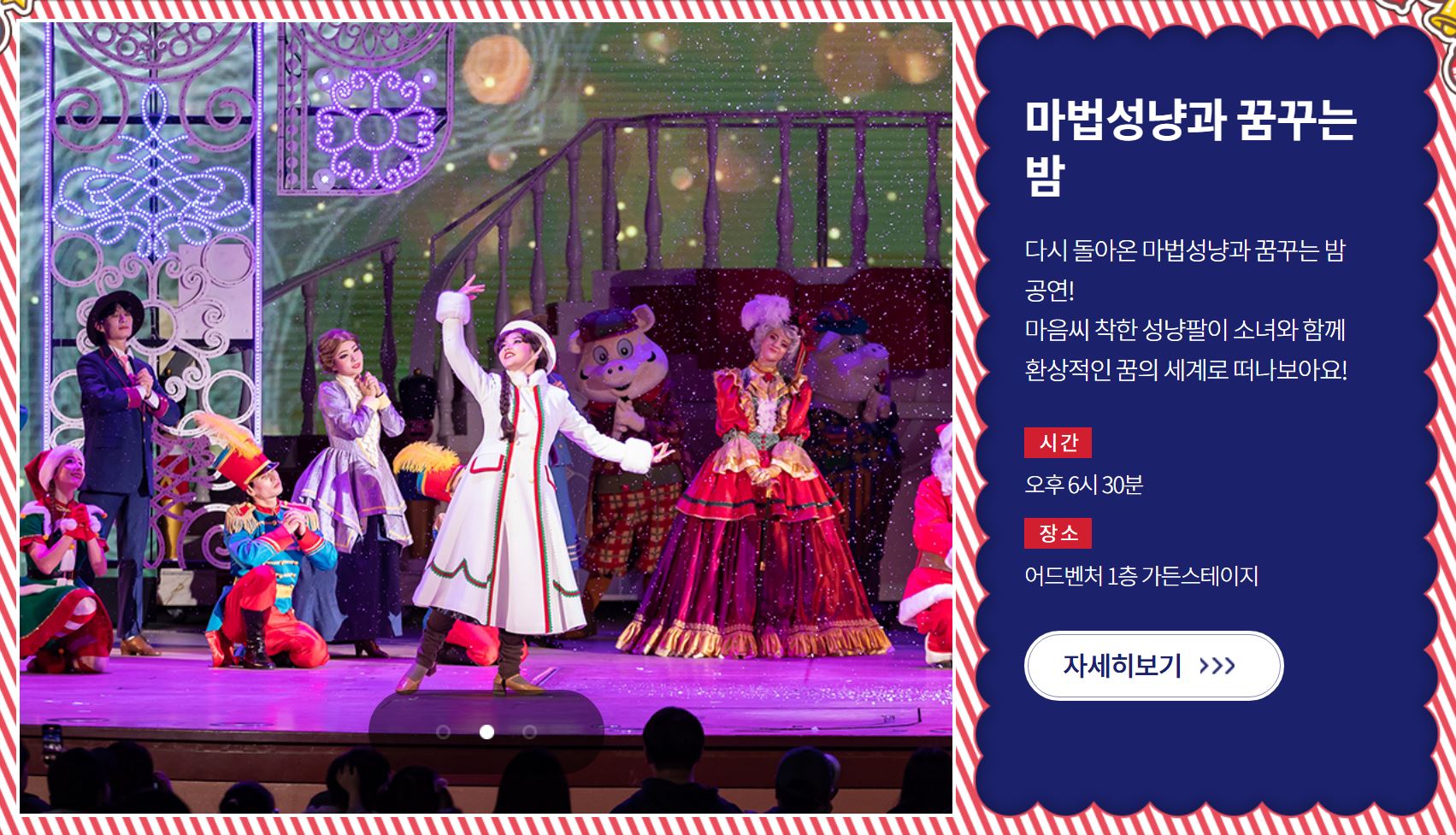 - 설명: 화려한 크리스마스 맵핑쇼가 매직캐슬에서 펼쳐집니다. 조명과 음악이 어우러져 환상적인 겨울밤을 선사합니다.