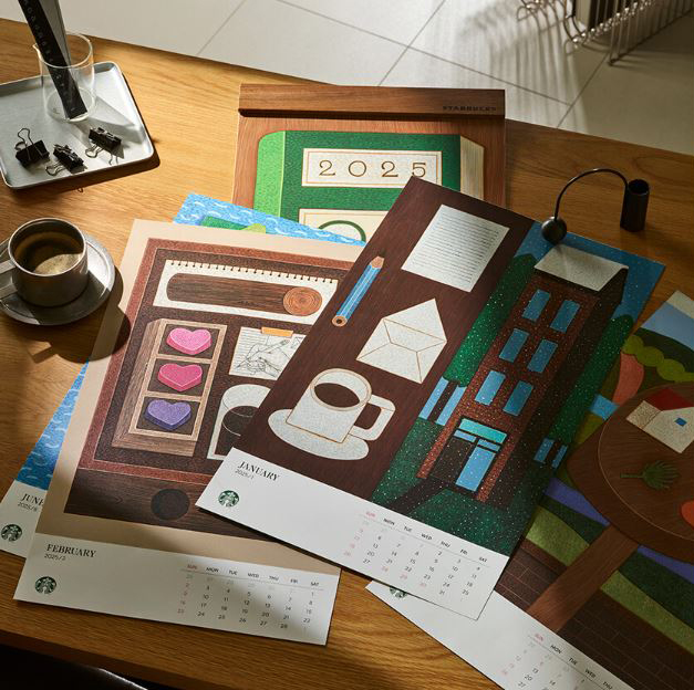 - 스타벅스 캘린더: 인테리어와 예술적 감각을 중시하는 분들에게 추천합니다. 커피와 예술이 만나는 순간을 표현한 이희조 작가의 감성적인 일러스트가 돋보이며, 매달 새로운 작품을 만날 수 있어 소장 가치가 높습니다.